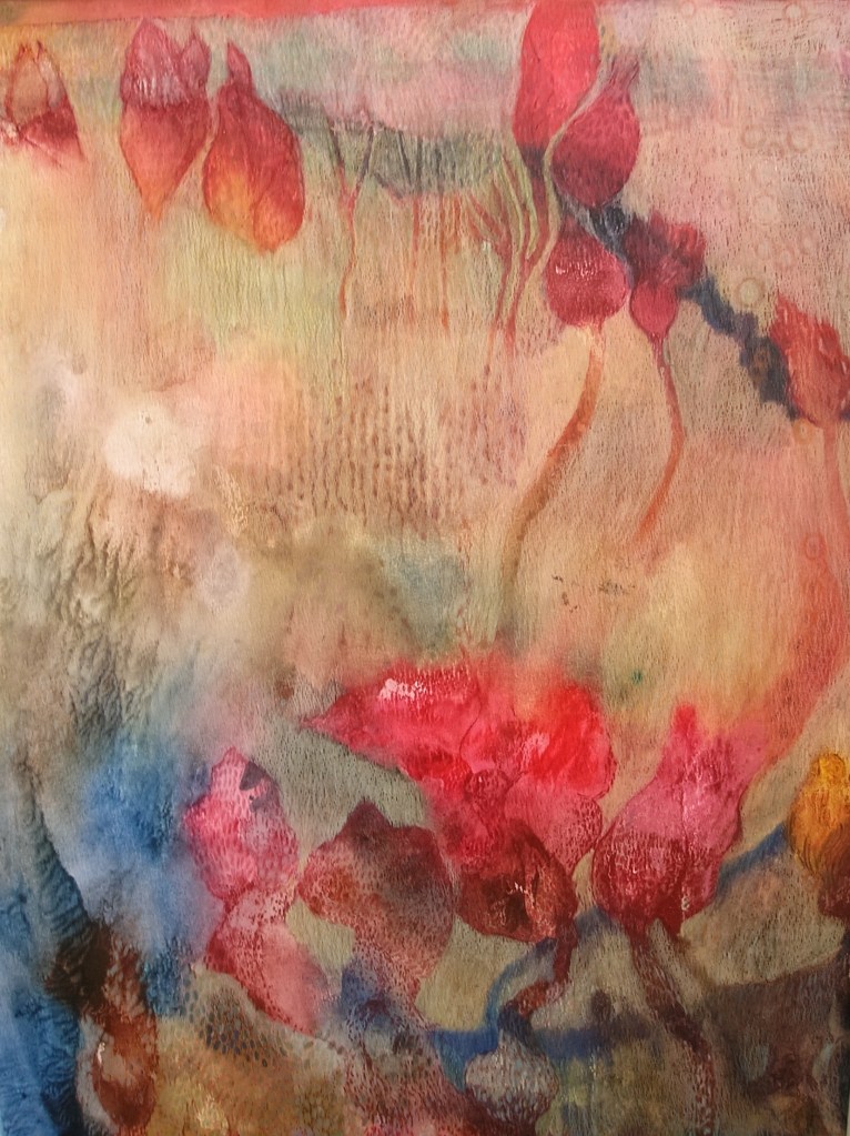 ‘Red Buds’ is the title of the work from which a detail is used as a banner at the top of the front page. It is a monotype which is a type of one-off print. I made it by covering an acrylic sheet in blockprinting ink and watercolour paint and then pressing the sheet onto paper. Other than choosing colours and where to add them the initial print is not planned – the colours will run and seep into each other. Once the print had dried I used coloured pencils to accentuate forms and create an ‘image’. ‘Red Buds’ measure 61×46 cm.