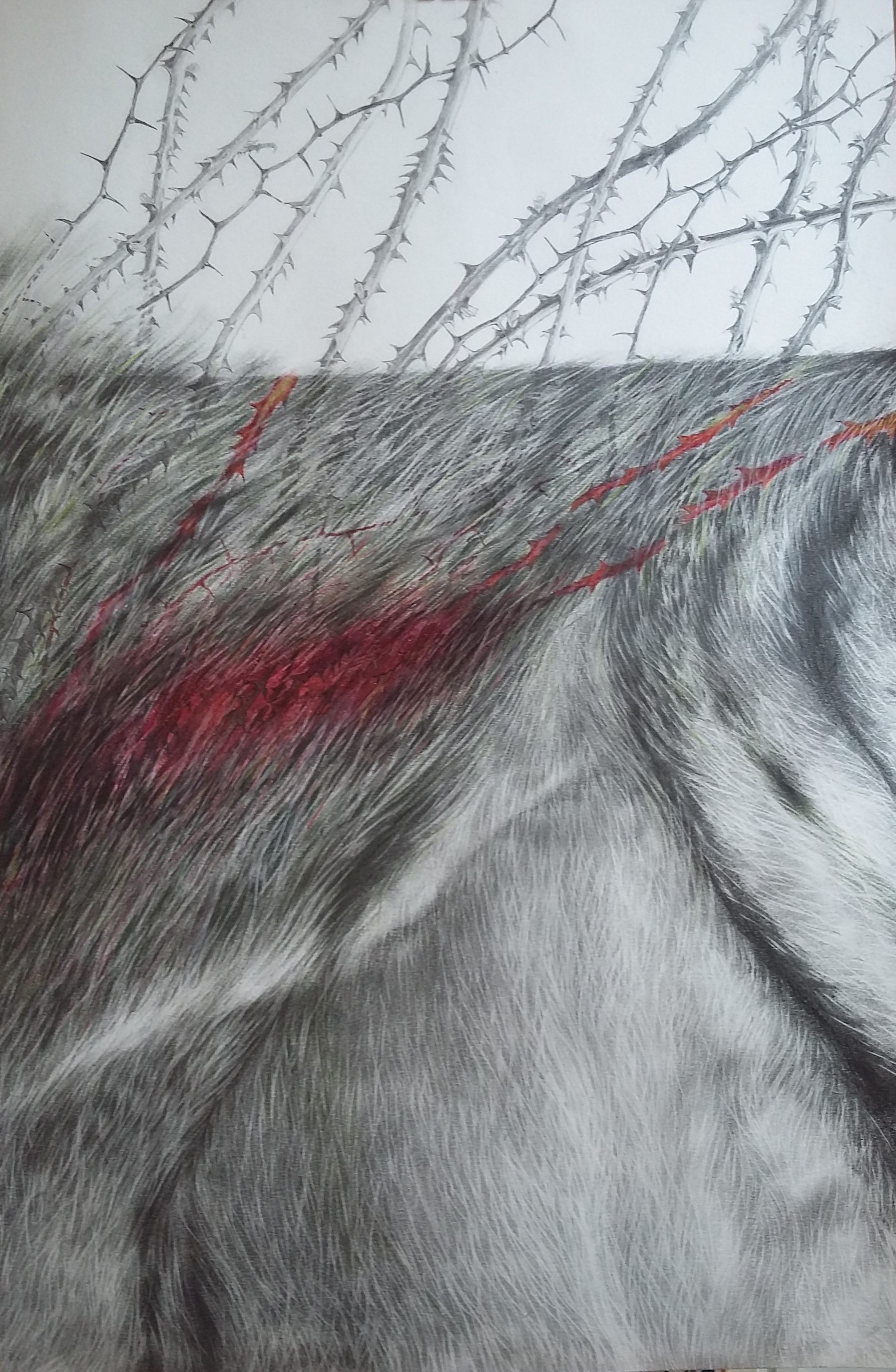 Procrastination is something I’m battling. I had the intention this morning of starting something new in oil – and then I took out this piece and started ‘fiddling’. It had to stop and this is it. It’s been toned down and hope, in the shape of green, was added. Thorns, as some sort of weapon (and absolutely not with any religious intentions) is another theme that I seem to be addicted to.