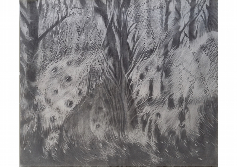 The blurring of different life-forms continues in this work. I now see a wind flowing through the wood and its ‘other’/partner, moving branches and exposing an underlying being. There is what looks like a sunlit glade. Even if you have stared at and worked on a piece for an extended period you can surprise yourself looking at it later!