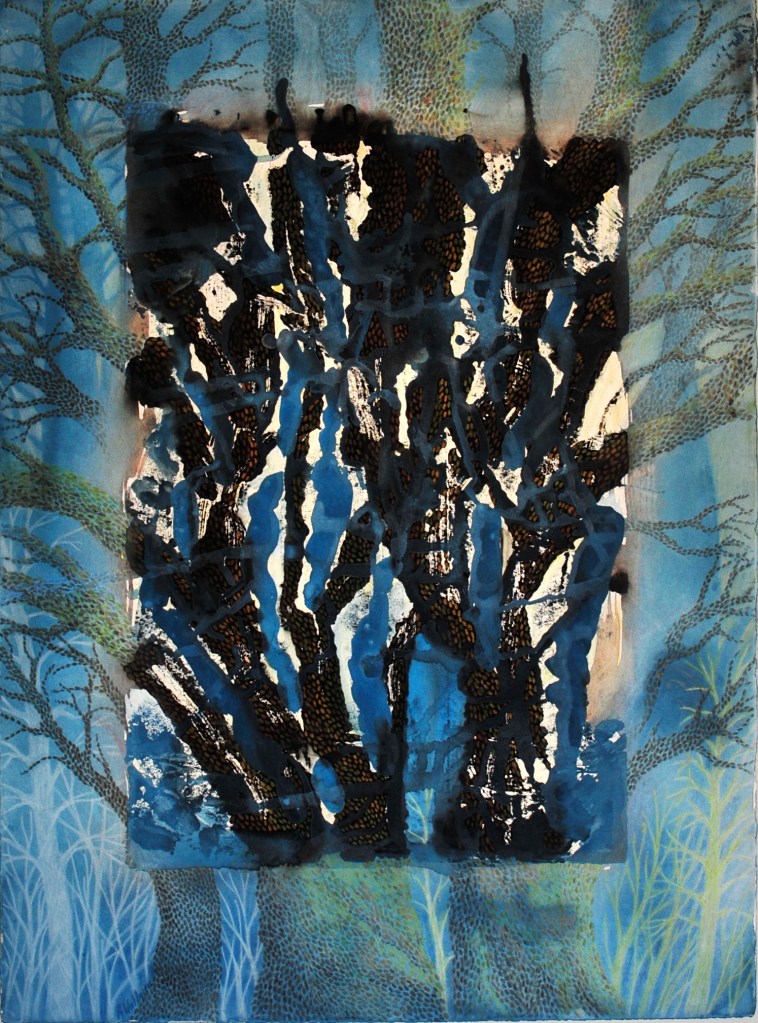 The title for this piece is taken from an interview with Ian McKeever, an artist whose work I love. It seems we both start with a layer and then, at least I, push against what whould seem to be an inevitable progression. It must not just go there, colours blazing and forms fitting in. Although of course I seek some balance, coherence and beauty and looking at it now perhaps ‘some’ is an understatement. My preoccupation with the unseen systems of warning, information and protection used by trees is one aspect of this piece, I also wanted to show that life is still going on inside them despite their loss of leaves in the winter.