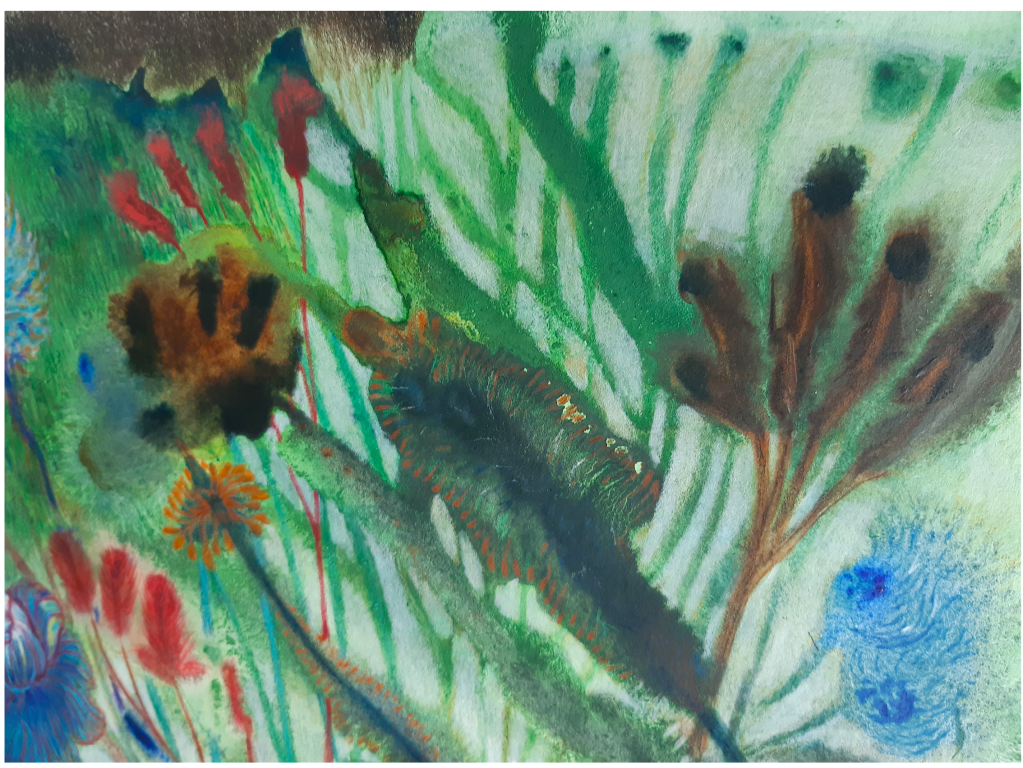 An abundance of plants, a snapshot with a dark border. Yet again, a monoprint, this time with water colour and then, again, coloured pencils. You might have a look at Garden, an earlier post, a bit of a series developing. And both left-leaning for some reason. It is said that the eye is more sensitive to movements coming in from the left so these two are clearly not taking advantage of this ‘flow’. Just realised that as these are monotypes where I first paint on an acrylic sheet, using my right hand, before turning upside down and pressing the painted sheet down on paper. Perhaps it is more natural for the hand/arm to move from bottom left to top right thus creating a curved movement in the work? Hmm ……