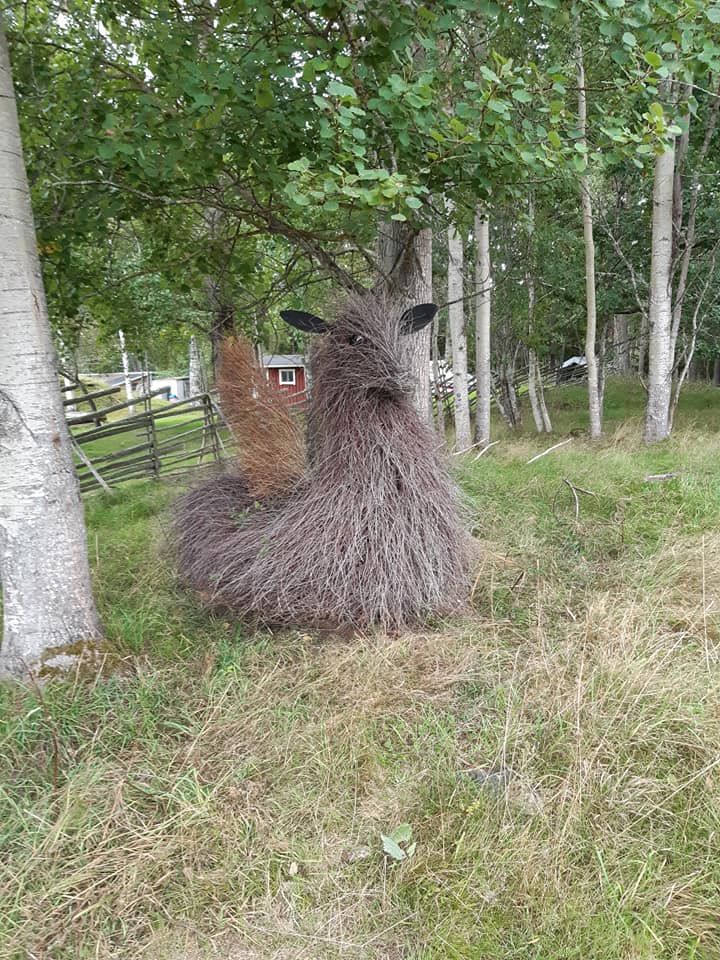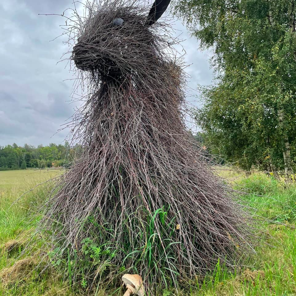 This creature was made for a local outdoor art exhibition in place over the summer. I covered the frame made out of chicken netting with birch and fir twigs from already felled trees. Eyes are pieces of glass from bowls found at a charity shop. It was a fun, hands-on project!