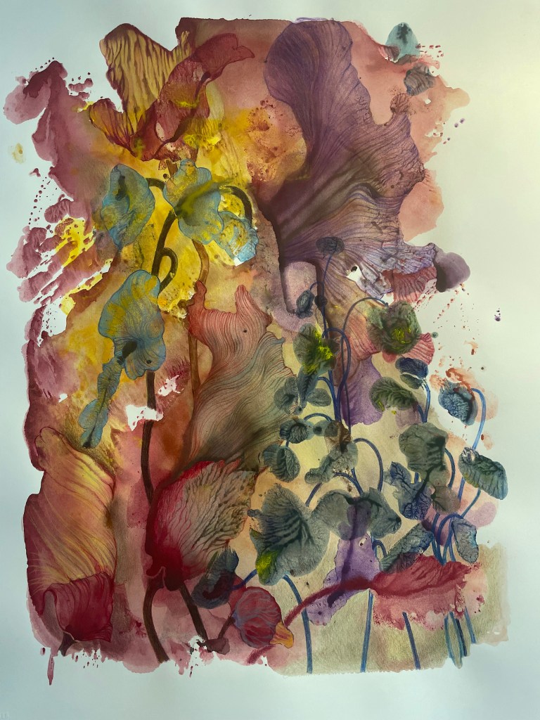 The monoprint was made last summer, and now that we are in the dark days of January, the yellow light in the print was a tempting starting point. I start drawing with no idea really how it will end, the blobs and areas of colour just suddenly asks to be connected or enhanced. And here I feel that I can add a quote from Maggie Hambling “You haven’t a clue what’s going on and that’s the best place to be in”.