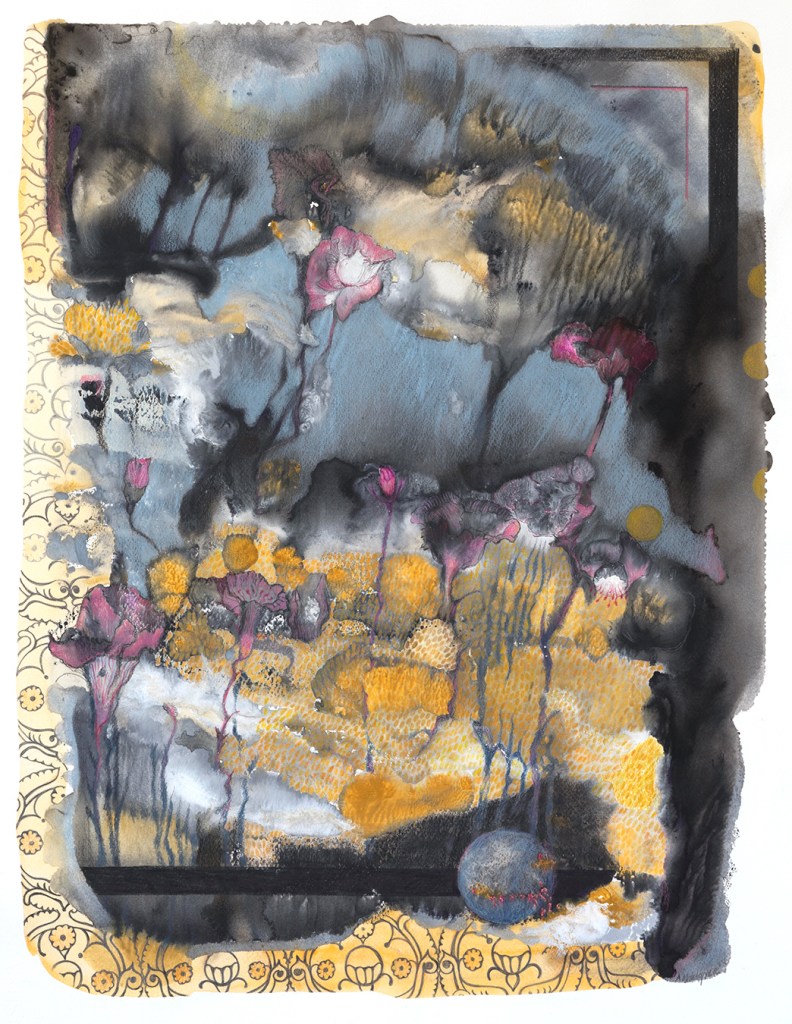 Number 2 of what could be a series – six of which I feel are almost there. I’m hanging them on the walls in my studio, waiting for them to ‘speak’ – more colour? tone down or highlight an area? add more ‘features’? Sometimes it takes weeks before a piece is silent and lets me put it on the shelf. I did the ‘base’ last summer in a flurry – I could almost call it inspiration – but it was more of finding the right colours to use. Kept looking at them but nothing moved me to start drawing. Did try though but had to erase my efforts. Colour is what I start with and with the monoprint I’m leaving it up to the unpredictability of the print to create a structure. I can now use a quote from Braque “Let us forget things and consider only the relationships between them” – in this case colours instead of “things”.